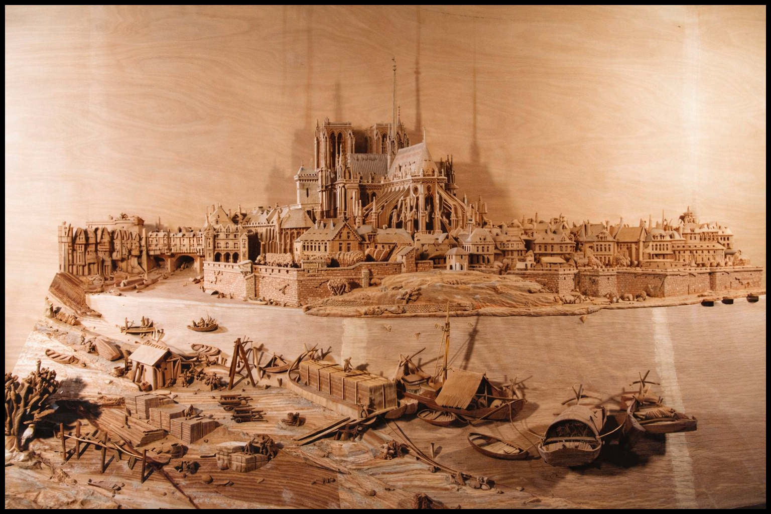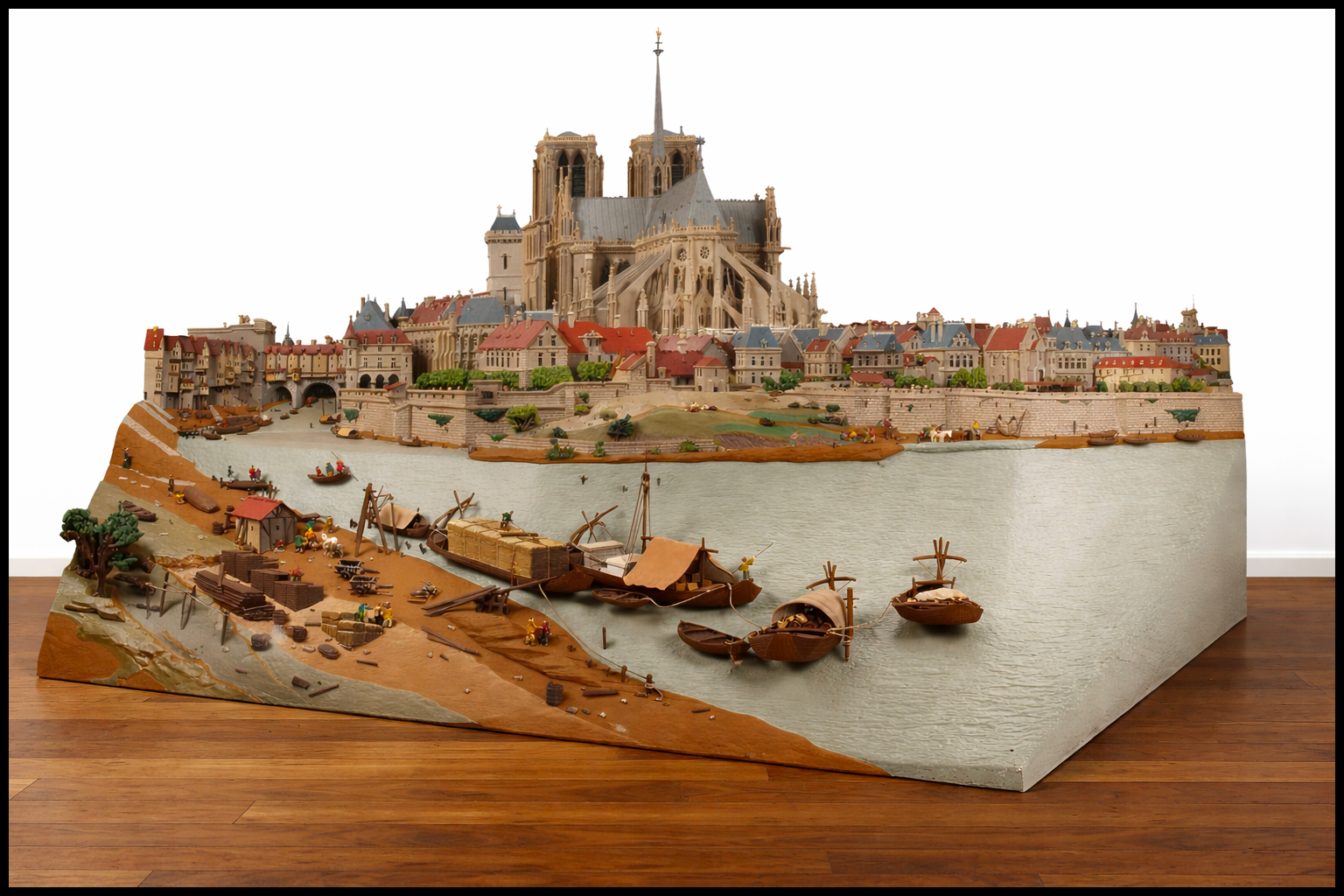 Réalisée entièrement à la main, cette importante maquette représente l'île Saint Louis et les Quais de Notre-Dame de Paris, vers 1595. Véritable tableau en trois dimensions, cette œuvre témoigne avec une précision impressionnante du Paris du 16ème siècle et de la vie qui s’y déroulait.